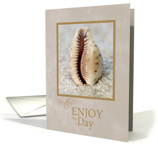 Photographic Cypraeidae seashell in sand encouragement card for Brother. Enjoy the day and discover beauty in every single day.