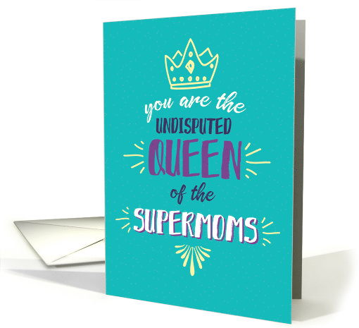 | Artist Notes: | Encourage a mom you know with this unique hand-lettering style typography design featuring the message, "You are the Undisputed Queen of the Supermoms." Card is accented with hand-drawn crown and design ornaments in purple, yellow and white on turquoise background. Inside can be customized to suit your personal needs. |