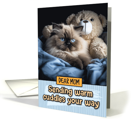 | Artist Notes: | A sweet Himalayan cat is cuddling with a big soft teddy bear on a blue bedspread with the text "dear mom sending warm cuddles your way" on a light blue striped background. A sweet design to send to your mother to show them your love and support. |