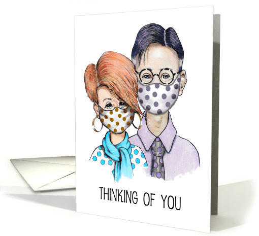 | Artist Notes: | The coronavirus is producing great financial difficulty for many people. Let someone know you are thinking of them as they face ups and downs in their work life, and as a result, in their finances as well. The front of this card features artwork of a couple wearing polka-dotted masks. Words say, "Thinking of you". Inside there is a verse, but, as always, this part of the card may be edited if desired. |