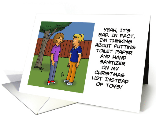 | Artist Notes: | Humorous Health Awareness Card About The Coronavirus/COVID-19. The cartoon shows two young girls. One says: Yeah, it's bad. In fact, I'm thinking about putting toilet paper and hand sanitizer on my christmas list instead of toys! Inside says: These are scary times, but we will get through it. |