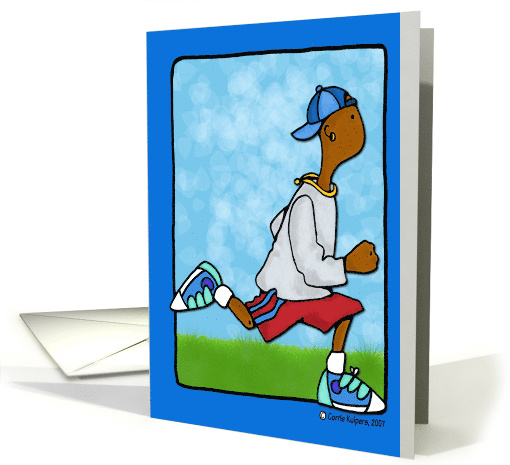 | Artist Notes: | A cartoon African American male running in his red shorts and backwards baseball cap on a blue and green background. Great encouragement card to send to someone who is running to keep fit. |