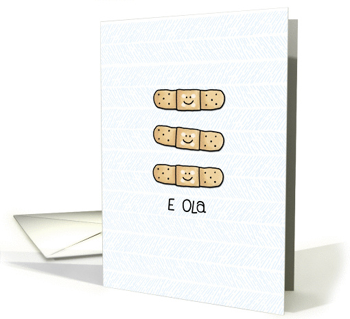 | Artist Notes: | 3 smiling kawaii (= cute) adhesive bandages stacked on top of each other in the center of this Hawaiian Get Well card. E Ola = Get Well Soon in Hawaiian |