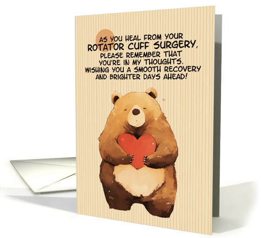 This get well feel better card features a heartwarming illustration of a cartoon bear holding a red heart. The bear has a soft, cuddly appearance with brown fur and a cream-colored belly. It's drawn in a cute, endearing style that conveys warmth and gratitude. The background is a light beige color with subtle vertical stripes, giving the card a gentle, comforting feel. The top portion of the card contains the text "as you heal from your rotator cuff surgery, please remember that you're in my thoughts. Wishing you a smooth recovery and brighter days ahead!". A sweet and heartfelt get well card to send to a friend, family, or loved one to let them know they are not alone at this moment in time.