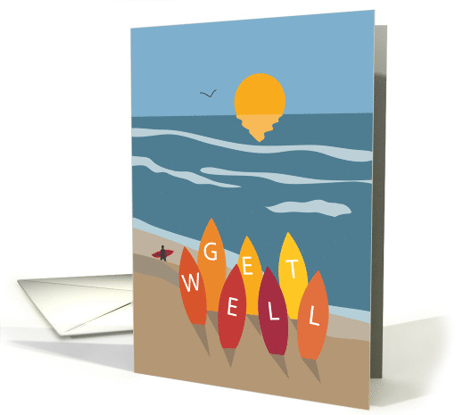 | Artist Notes: | Illustrated get well sports card. A beach with surfboards sticking up out of the sand. The surfboards spell out get well. The ocean with waves and a sunset can bee seen along with a surfer walking towards the surf. Inside text: Catch the wellness wave. Feel better. |