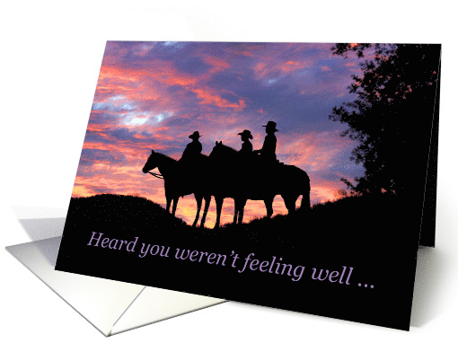 When you hear someone is not feeling well, it's great to send thoughts of feeling better with a get well card. This country themed card has a group of cowboys in a pretty sunset with a positive message inside.