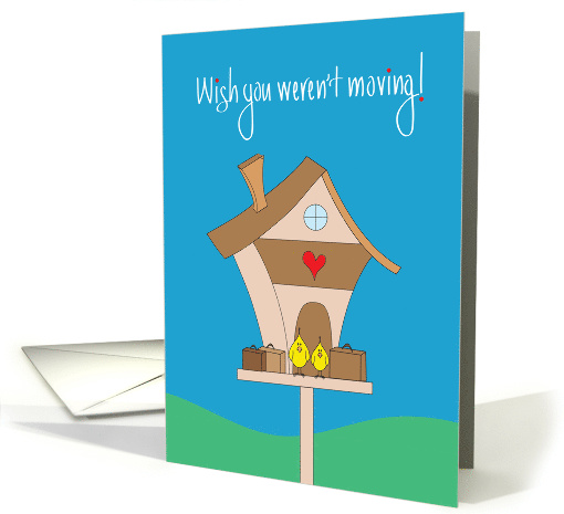 | Artist Notes: | These two little birds are all packed up to move, with the hand lettered wording overhead "Wish you weren't moving!". Perfect to give or send to friends or neighbors who are being relocated to another city or state, this card will let them know how much they will be missed, as well as wish them good luck in their future. The inside wording of the card is "We wish you a wonderful future in your move. We are going to miss you so much!" |