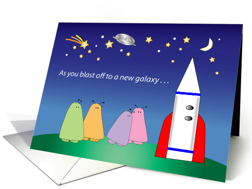| Inside: | . . . we want you to know how much you’ll be missed! May you have a smooth trip, adventure around each corner, and new friends to make you feel at home. You are all out of this world! |