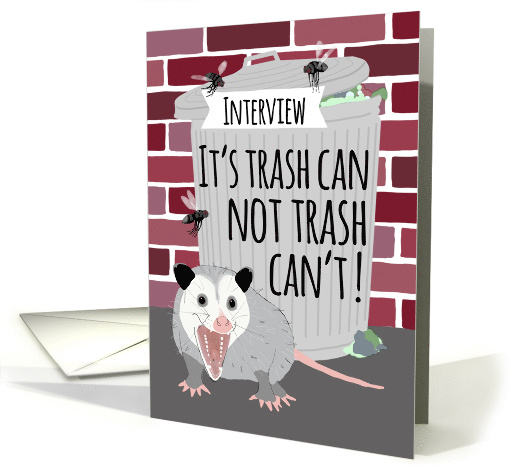 | Artist Notes: | A really fun good luck card to send to a friend or loved one who has an important interview. This charming card features an optimistic opossum, a trash can and some flies. |