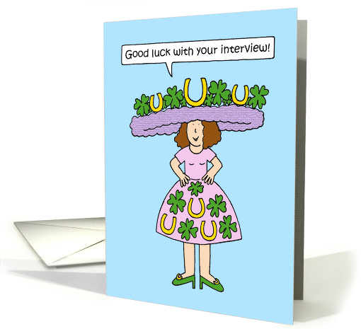 | Artist Notes: | A cartoon of a lady wearing a hat, shoes and dress decorated with golden horseshoes and four leaf clovers. The lady is saying 'Good luck with your interview!' |