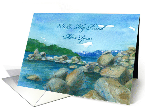 | Artist Notes: | A custom name hello greeting card featuring a watercolor landscape painting of Sand Harbor Lake Tahoe with snow capped mountains and blue water. A nice nature card to keep in touch with friends and family! |