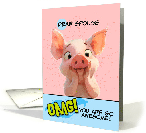 This card features an adorable cartoon pig with an exaggerated expression of surprise and excitement. The pig's face is prominently displayed, with wide eyes, a pink snout, and its hooves pressed against its cheeks in a classic "OMG" pose. The background is a soft pink color with subtle speckles, giving it a warm and playful feel. The text at the bottom of the card reads "OMG!" in large, bold lime-green letters on a light blue background. Next ot that, in smaller black text, it says "you are so awesome!", tying the pig's expression to the sentiment of the card.