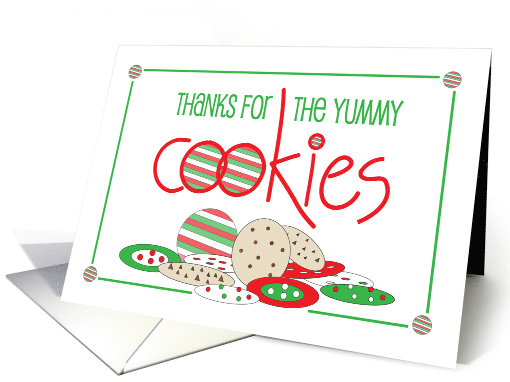 "Thanks for the yummy Cookies" is the hand lettered wording, at the very top of this white cookie card. The word "Cookies" has two cookies, at the center, in the letters "O" that overlap, with frosting in them. Below, a large grouping of holiday cookies are gathered, in colors of red, green and white, with a few chocolate chip cookies added. Some cookies have speckles and some are striped. The inside wording of the card says "Thanks so much for your tasty Christmas treats! They were delicious!"