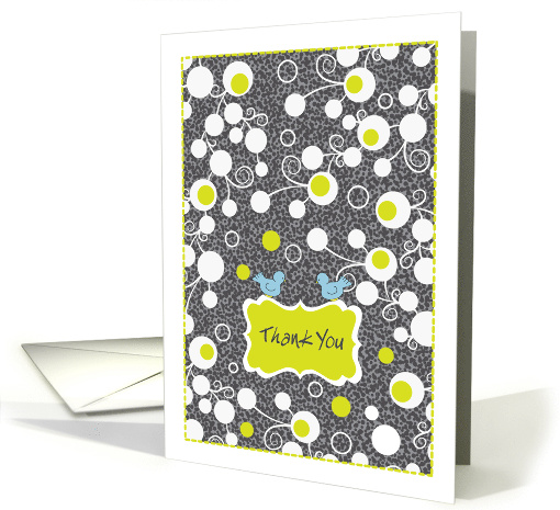 | Artist Notes: | This thank you card is for thanking for a wedding invitation. The cover features an abstract design in white, citron, and grey. There are a white border and 2 blue love birds. You may change the inside message if you wish. ©Gail Pepin |