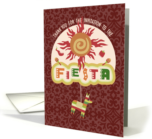 | Artist Notes: | Illustrated Thank You card for being invited to a fiesta. Reddish-brown dark tile background with an archway featuring a sun, maracas and peppers and a dangling pinata. Text on front of card reads: "Thank you for the invitation to the fiesta." Inside text reads: "It was great fun with good food. Thank you for inviting us." |