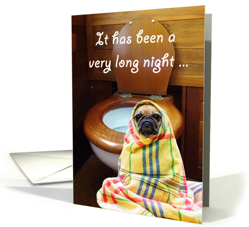 | Artist Notes: | A pug dog wrapped in a colorful blanket beside a toilet with a wooden seat."It has been a very long night ..." is written at the top, and inside"... and thank you for the kind invitation to your party, I did have a wonderful time" |