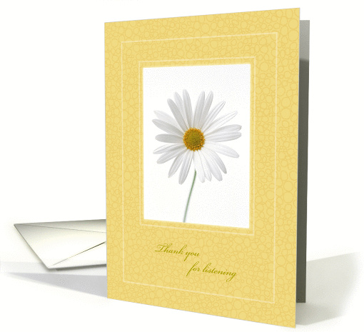 Thank that special person for taking the time to listen and let them know how important their presence is with this simple, yet beautiful photograph of a single white shasta daisy on a cheerful, spring-like yellow circled background. A great way to thank someone for being there. Original Design by Sue Nollmeyer©2014. 41614