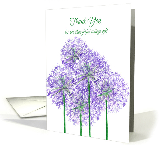 | Artist Notes: | A note of thanks for a thoughtful college gift decorated with allium flowers in full bloom painted with watercolor in a variety of purple shades and tall green stems on a white background |