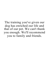 The training you've given our dog has enriched our life and that of our pet. We can't thank you enough. We'll recommend you to family and friends.