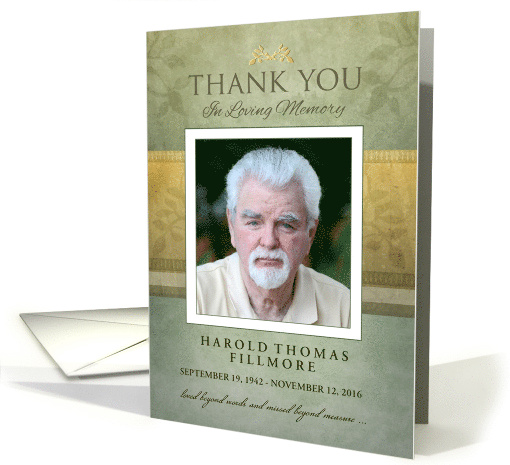 | Title: | Thank You Elegant Green & Gold Leaf Custom Photo Memorial Card |