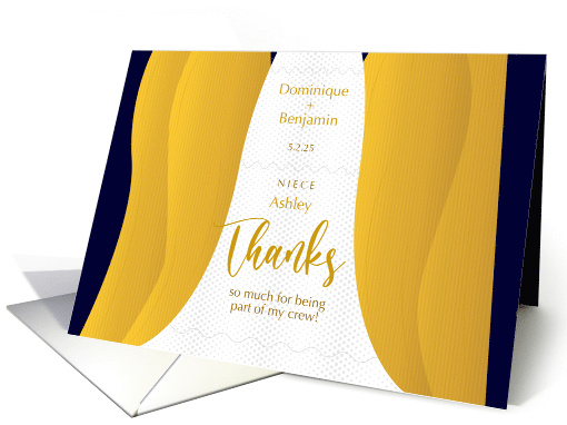 Artist Notes: | Customize the bride's and groom's names, wedding date, & relationship to the bride plus the Junior Bridesmaid's / matron of honor's / maid of honor's / bridesmaid's name on the front of this pretty "Thanks for being part of my crew" card ~ with bride and yellow gold maids' gowns! |