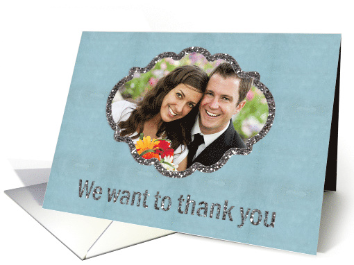 Say a special thank you to your wedding party with this custom photo frame. The picture window has a silver glitter-effect frame.