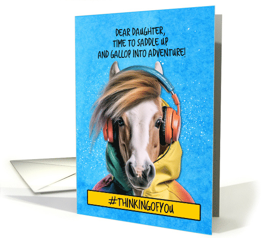 A pony in a rainbow-colored hoodie wearing orange headphones on a blue watercolor background with white splatter and the text "Dear daughter, time to saddle up and gallop into adventure!" and the hashtag #thinkingofyou in a yellow box. A fun card to send to your daughter while they're at equestrian camp.