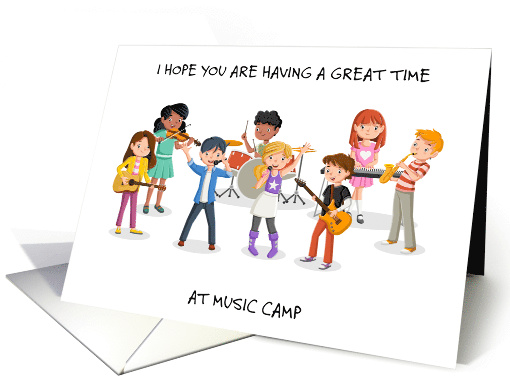 An illustration of a group of young people playing a variety of different instruments. The words 'I hope you are having a great time at music camp' accompany the illustration.
