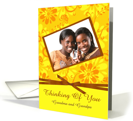 | Artist Notes: | A Thinking Of You photo card with a brown frame for you to place your photo in. Background is a pretty yellow and gold flower pattern with a brown bow and text. Front also has a text box for you to personalize it whatever way you choose. Example grandma and grandpa. Inside like all GCU can be personalized by you if you wish to give it your own personal touch. |