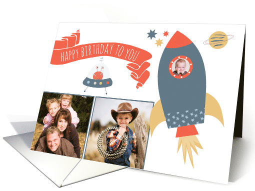 | Artist Notes: | Colorful birthday card with slots for three pictures, one of which is a place to put your son or daughter's head in the window of a cute spaceship heading toward the stars. Card also has a an adorable little alien, planet and a banner that reads "Happy Birthday to You" Designed by Simply Put by Robin; elements from The Hungry Jpeg. |