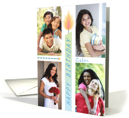 | Artist Notes: | Pick out 4 of your personal photos for this custom Birthday card with a green and blue happy birthday candle. Time to remind your Sister to make a birthday wish. İMindy Pierce |