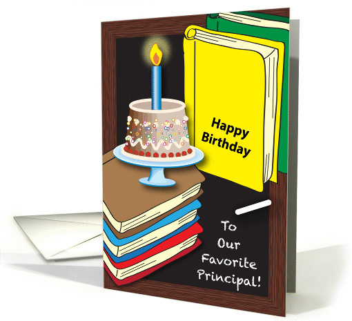 | Artist Notes: | This is a birthday card for a school principal, featuring my digital design of colorful books, cake, candle, chalk, all against a black chalkboard. You may change the inside message at check out, if you wish. |
