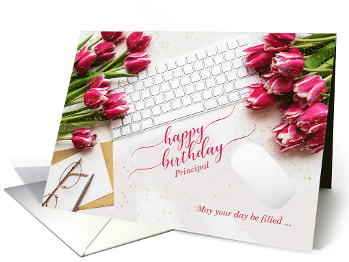| Title: | Principal's Birthday Pink Tulips and Desktop with Keyboard |