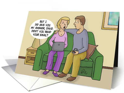 Humorous proposal card. There is a cartoon of a couple on the sofa. He has a ring in his hand, she's on her laptop. She says, But I did give you my answer, David, didn't you read your email? Inside says, I hope you give me your answer personally! I Love You