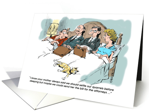 The argument may have begun in the bedroom but this cartoon couple has a way to stay together in the name of love. This reconciliation announcement card can be sent to anyone but the lawyers. It would be upsetting to them.