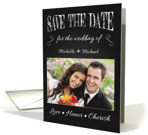 | Artist Notes: | Retro chalkboard ‘save the date’ wedding announcement with Love, Honor, and Cherish at the bottom. Customize the card with the couple’s names and picture. Perfect card to send to those announcing the wedding date for the big day. Design © 2015 Julia Bryant. |