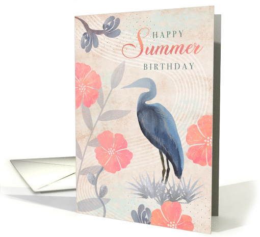 Celebrate the warmth of summer with nature-inspired birthday card featuring pink flowers and a blue hand drawn heron in a collage style.