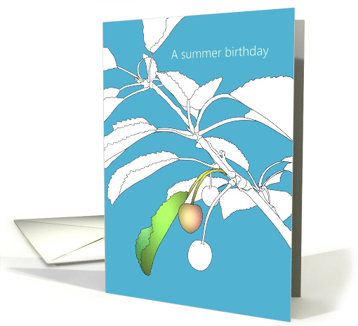 A summer birthday, featuring a stylized drawing of cherries on a branch. The image is drawn in black and white, with the exception of a single leaf and a single cherry which are colored in translucent green and yellowish-pink. The background is in blue.