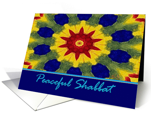 This painting shows a colorful rose window geometric mandala with a red central star with ten vectors followed by yellow, green, and blue extensions. It is based on an original painting on canvas by Artcor7 artist. The card has this image, a blue stripe with a line accent, and the expression: "Peaceful Shabbat!