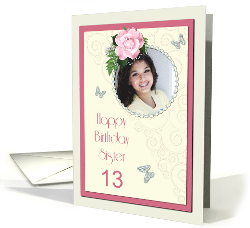 | Artist Notes: | Add your photo to personalize a unique and stunning birthday card for your sister's 13th birthday. Place your picture inside the diamond encrusted frame. A beautiful pink rose and jewelled butterfly completes the look. A very stylish and modern birthday card. All parts are printed. |