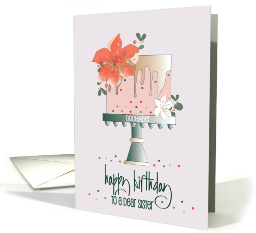 Your dear sister has a birthday coming up in the month of December and you would like a uniquely beautiful card for her this year. This birthday cake monthly flower card is the perfect way to say "Happy Birthday Dear Sister", which is the dark green hand lettered wording, at the very bottom of the card. Above, on a light green cake stand, a pink sprinkle-covered cake stands, with decorations of red and white poinsettias, the flowers for the month of December. The inside wording of the card says "Wishing you a birthday where all your dreams come true!"