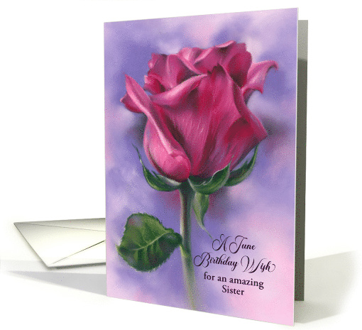 Your sister will adore this June birthday greeting with text that may be personalized just for her. The cover is embellished with a single, deep pink rose flower and green foliage on an ethereal backdrop of pale pink and purple created in soft pastel colors.