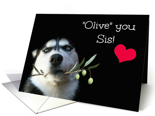 A cute and fun way to say Happy Birthday to your sister! Nothing cuter then a blue eyed husky, and this one has an olive branch in her mouth. Tell your sis OLIVE YOU on her birthday!