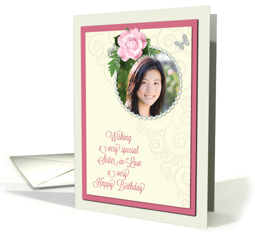 | Artist Notes: | Add your photo to personalize a unique and stunning birthday card for a sister-in-law. Place your picture inside the diamond encrusted frame. a beautiful pink rose and jewelled butterfly completes the look. A very stylish and modern birthday card. All parts are printed. |