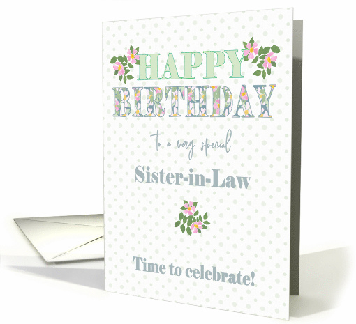 A pretty birthday card for a sister-in-law with pink dog roses on a polka dot background. The front cover greeting is, 'HAPPY BIRTHDAY to a very special Sister-in-Law', with the word 'BIRTHDAY' filled with a pattern of pink and white dog roses and the rest of the text in greyish green. At the bottom of the card front are the words, 'Time to celebrate!' and the inside message is just a suggestion which you can easily change or delete if you wish.