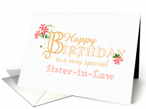 An elegant, minimalist birthday card for your sister-in-law with gold-effect lettering and pinkish-red Clematis flowers and their long, rambling stems and leaves. The front cover greeting is, 'Happy Birthday to a very special Sister-in-Law' in gold-effect lettering with an outsize letter 'B' entwined with a cluster of Clematis flowers and its long shoots and leaves. The word, 'Sister-in-Law' is in a pinkish-red to match the flowers, all on a lightly textured white background. You can easily edit the inside message to suit your needs or delete it altogether if you prefer a 'Blank Inside' birthday card.