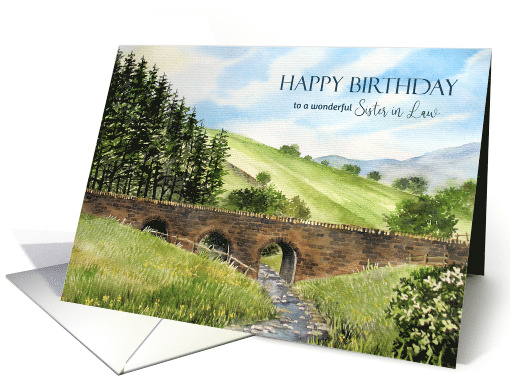 Send a piece of the North of England to someone special with this delightful greeting card. Watercolor painting by myself Farida Greenfield of Scawgill Bridge over River Aiken in Lake District. A lovely peaceful scenery of the rolling hills on the background of the bridge and conifers leading to Whinlatter Pass with gentle stream running underneath the bridge. The beautiful landscape is sure to evoke a sense of calm and tranquillity, perfect for sending warm wishes to your loved ones. The card design is for Sister in Law on Birthday.