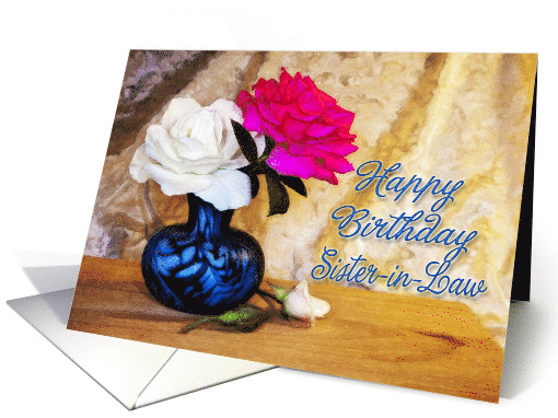 Send a card full of roses to say happy birthday to a sister-in-law. A lovely way to send your birthday wishes. Two beautiful full-blown roses in a lovely blue vase.