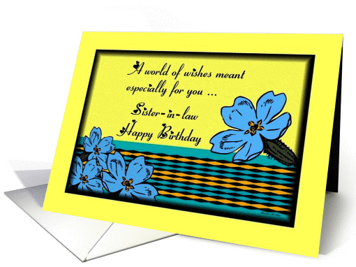 Pretty Primrose flowers makes a beautiful Birthday Card for your Sister-in-law. The card has primrose flowers on a pastel blue and yellow diamond background. With Text on the front cover.