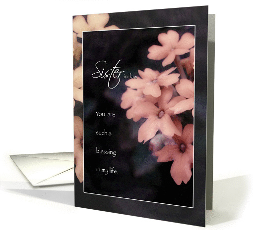 A beautiful birthday card for Sister in Law features a photo of peach garden phlox flowers that has been altered in photoshop to appear as if it was a watercolor painting. Soft peach petals on the top layer with delicate white border and underneath, the colors have been softened into yellows. The sentiment lets her know what a blessing she has been in your life.